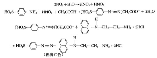氮氧化物(NOx)包括一氧化氮(NO)及二氧化氮(NO2)等。在采样时,气体中的一氧化氮等低价氧化物首先被三氧化铬氧化成二氧化氮,二氧化氮被吸收液吸收后,生成亚硝酸和硝酸,其中亚硝酸与对氨基苯磺酸起重氮化反应,再与盐酸萘乙二胺偶合,呈玫瑰红色,根据颜色深浅,用分光光度法测定。