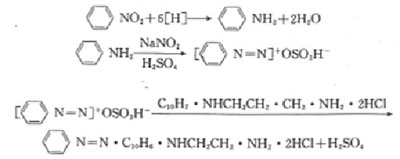 用稀乙醇溶液吸收的硝基苯,在常温酸性条件下,由锌粉反应产生的初生态氢还原成苯胺,经重氮化后与N-盐酸萘乙二胺偶合反应生成紫红色偶氮染料,该染料的色度与硝基苯的含量成正比,在550nm波长处用分光光度法测定,反应式如下: