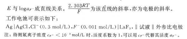 当氟电极与含氟的试液接触时,电池的电动势F随溶液中氟离子活度变化而变化(遵守Nernst方程)。当溶液的总离子强度为定值且足够时服从关系式:
