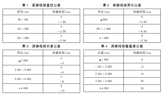 3.6 滤袋框架的直径、周长长度和垂直度偏差应符合表1至表4的规定。