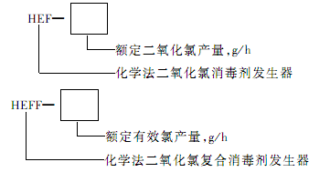 示例2:HEFF-100指额定有效氯产量为100 g/h的化学法二氧化氯复合消毒剂发生器。