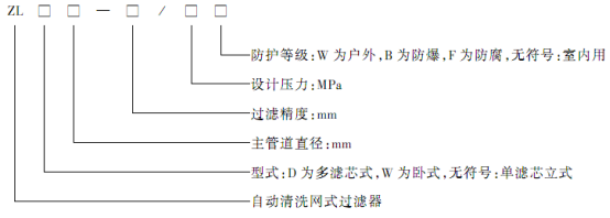 示例:ZLDW 250-0.2 / 1.0指过滤精度为0.2 mm,设计压力1.0 MPa,管径为250 mm的多滤芯卧式室内用自清洗过滤器。