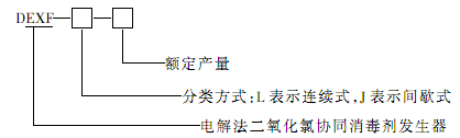 示例:DEXF -L-400指额定产量为400 g/h的连续式电解法二氧化氯协同消毒剂发生器。