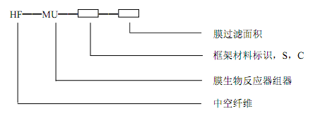 示例:HF-MU-S-300 表示框架材料为不锈钢、膜过滤面积为 300 m2的中空纤维膜生物反应器组器。