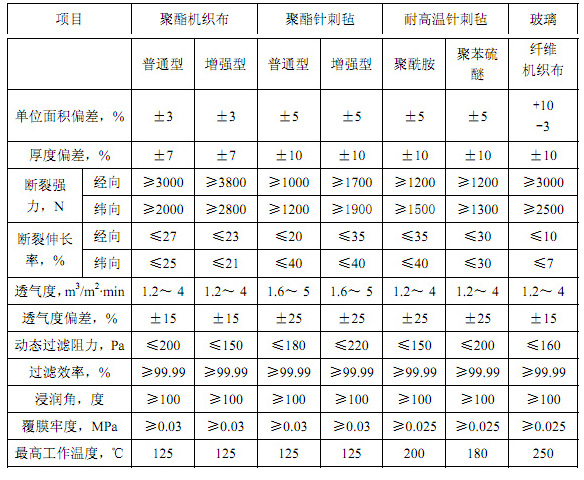 4.3 覆膜滤料的主要性能指标应符合表 1 的规定。