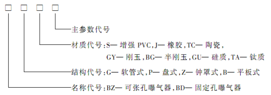 结构代号:G— 软管式,P— 盘式,Z— 钟罩式,B— 平板式名称代号:BZ— 可张孔曝气器,BD— 固定孔曝气器