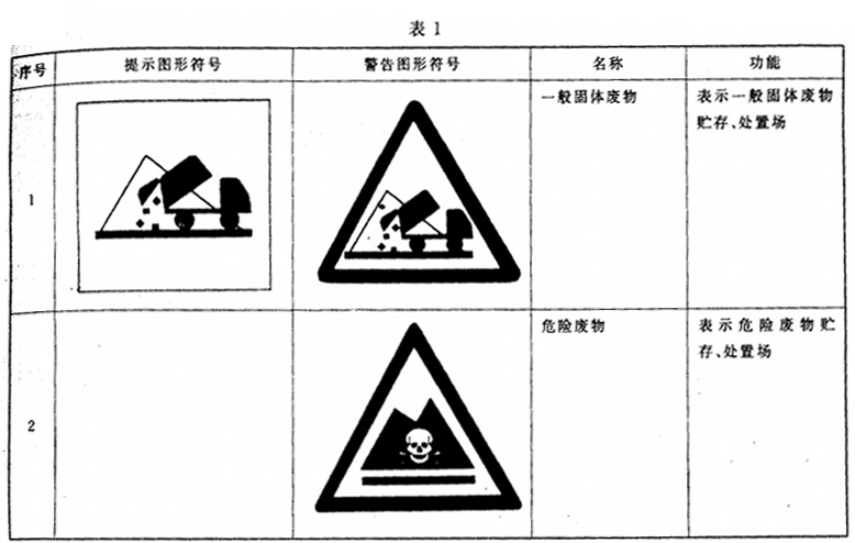 固体废物贮存、处置场图形符号分为提示图形符号和警告图形符号两种,图形符号及说明见表1。