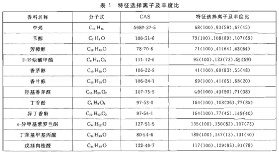 j)扫描方式:选择离子扫描,特征选择离子及丰度比见表1。