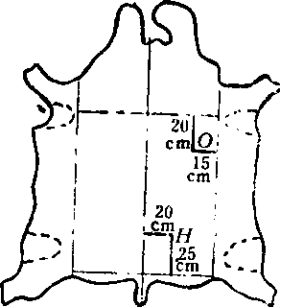 2.2 铬鞣黄牛篮球、排球革、植蹂黄牛外底革、轮带革按标准点H测定厚度,在O点上也测定厚度。