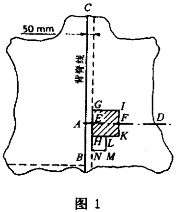 切取GJKH带影条的方块或切取HLMN无影条的方块(见图1)。皮块的部位按下面的规定。