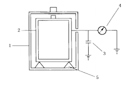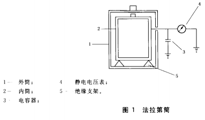 见图1。外筒直径50 cm-70 cm,高85 cm-100 cm,内筒直径40cm-60 cm,高75 cm-95 cm,电容器的泄漏电阻1×1012Ω以上,电容值应与静电电压表量程相匹配,绝缘支架的绝缘电阻应在1×1012Ω以上。系统电容可用精密万用电桥或其他电容测量仪测量。