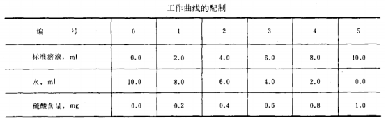 3.3 硫酸标准溶液:准确称取1.777g硫酸钾(优级纯,800°C下恒重)溶于水中,稀释至1 L。此溶液1ml相当于1.0mg硫酸。分析时用水稀释10倍成1 ml相当于0.1 mg硫酸的标准溶液。