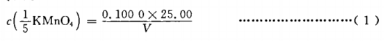 1.1.4.3 高锰酸钾溶液[c(1/5KMnO4)=0.100 0 mol/L]:称取3.3 g高锰酸钾(KMnO4),溶于少量纯水中,并稀释至1 000 mL。煮沸15 min,静置2W。然后用玻璃砂芯漏斗过滤至棕色瓶中,置暗处保存并按下述方法标定浓度: