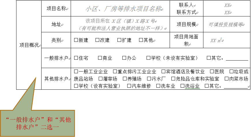 5、本表封面的“申请类别”一栏,申请人如果是首次申请,请在“首次申请”后的方括号内打勾;如果是由于排水口数量和位置、排水量、污染物项目或浓度等许可内容变更重新申请,请在“变更申请”后的方括号内打勾;如果是延期申请,请在“延期申请”后的方括号内打勾。“基本情况”部分“用水量”、“排水量”需提供相关依据,“污水预处理方式”如是委托处理,在相应的方框内打勾即可,如是自行处理,还需注明污水处理工艺。