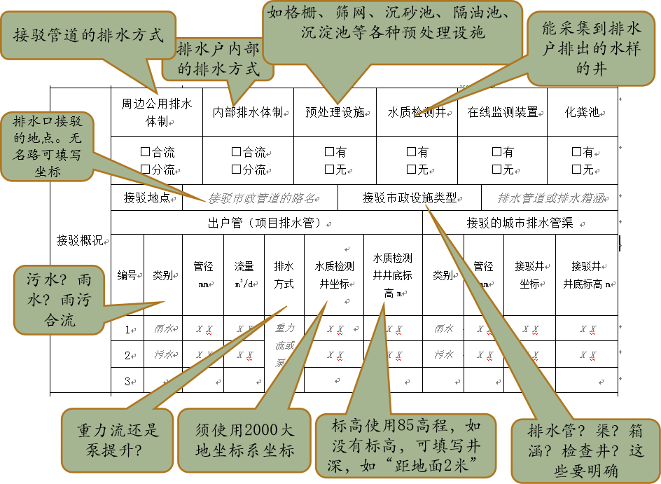 7、“排水水质情况”应按照由具有计量认证资质的排水监测机构出具的排水水质检测报告填写;拟排放污水的新排水户应附水质、水量预测报告。