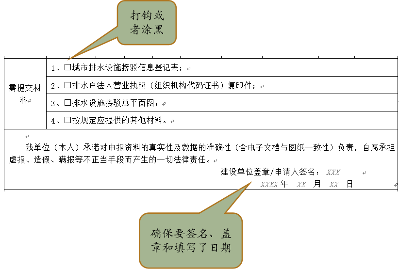 1)申请单位制定排水(污水)设施接驳方案后填写《城市排水设施接驳信息登记表》,并经排水(污水)管理单位盖章确认;