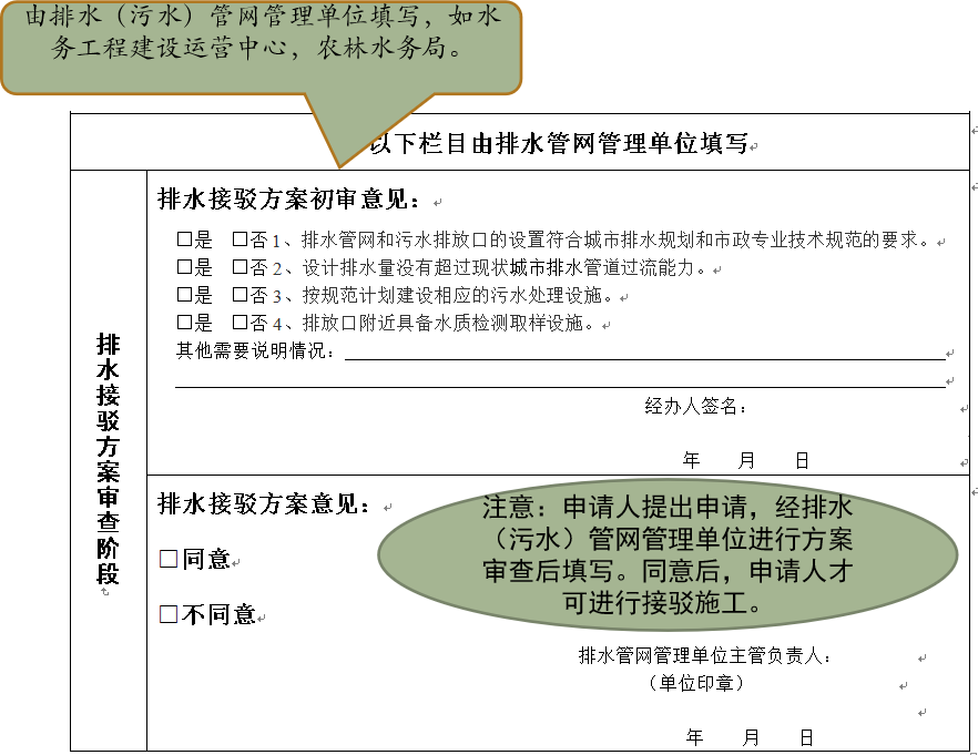 2)申请单位按照经排水(污水)管理单位同意的接驳方案进行施工,工程完成后经排水(污水)管理单位验收并盖章确认。