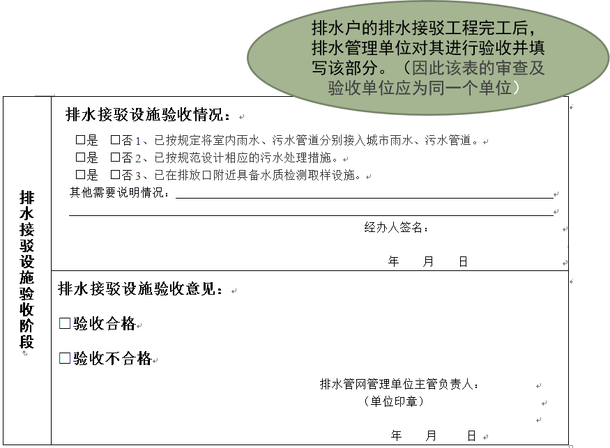 3、排水户具体的接驳方案是否已经管网管理单位验收通过(是否已完成接驳信息登记表的登记和验收);