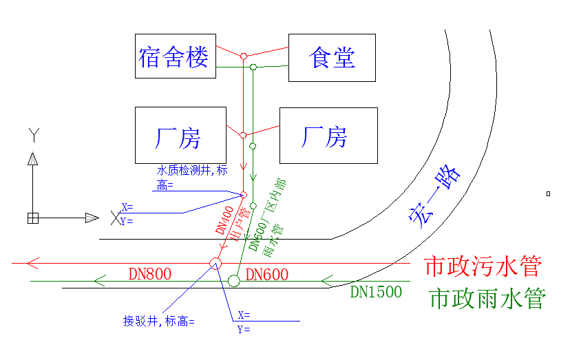 2、图纸要如实反映相关情况,能根据该图纸标识找到排水出户管、水质检测井、接驳井及被接驳的市政排水(污水)管渠的具体位置。