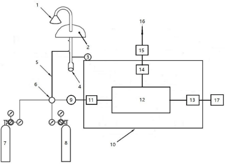 1-进气口;2-房顶;3-风机;4-除湿装置;5-进样管路;6-四通阀;7-零气;8-标准气体;9-颗粒物过滤器; 10-二氧化硫测定仪;11-碳氢化合物去除器;12-反应室;13-信号输出;14-流量控制器;15-泵;16-排空口; 17-数据输出。