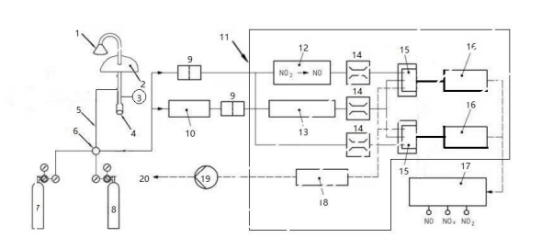 1-进气口;2-房顶;3-风机;4-除湿装置;5-进样管路;6-四通阀;7-零气;8-标准气体;9-颗粒物过滤器; 10-干燥器;11-氮氧化物测定仪;12-二氧化氮转换器(钼催化);13-臭氧发生器;14-流量控制器;15-反应室 16-信号输出;17-数据输出;18-臭氧去除器;19-泵;20-排空口。