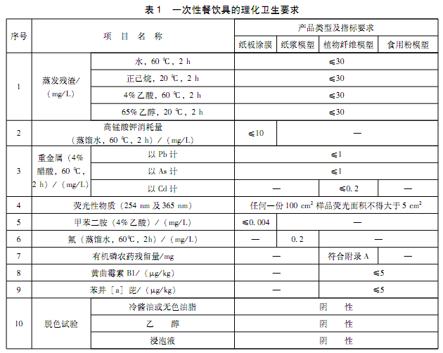 6.1.1 一次性餐饮具理化卫生指标应符合表 1要求。