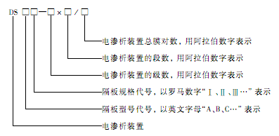 电渗析装置的型号由汉语拼音字母、罗马数字和阿拉伯数字按规则排列组成。