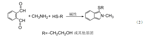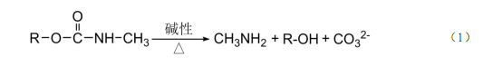 固体废物中的氨基甲酸酯类农药经有机溶剂提取、固相萃取柱净化、浓缩,浸出液样品经固相萃取柱富集、净化、浓缩,用液相色谱柱分离后,在碱性条件下水解生成甲胺(式(1)), 与衍生化试剂反应生成具有强荧光物质(式(2)),用荧光检测器检测。根据保留时间定性, 外标法定量。