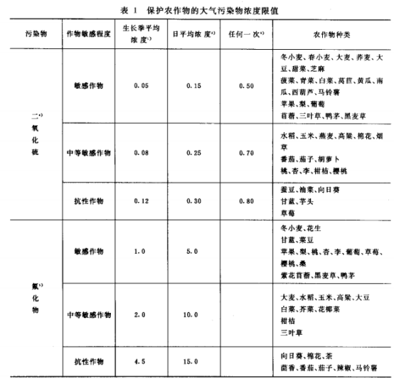 1 根据各种作物、蔬菜、果树、桑茶和牧草对二氧化硫、氟化物的耐受能力,将农作物分为敏感、中等敏感和抗性三种不同类型,分别制定浓度限值。农作物敏感性的分类是以各项大气污染物对农作物生产力、经济性状和叶片伤害的综合考虑为依据。各项大气污染物的浓度限值列于表1。