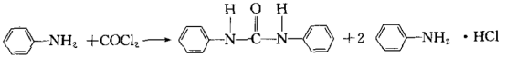 含光气(COCl2)的气体先经装有硫代硫酸钠和无水碳酸钠的双联玻璃球,以除去氯、二氧化氮、氨等干扰气,而后被苯胺溶液吸收,生成1, 3-二苯基脲,用溶剂在酸性条件下萃取,在波长257nm处测定吸光度,其值与光气含量成正比。反应式如下: