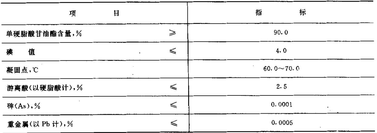 本标准适用于氢化棕搁油与甘油反应,经分子蒸馏装置提纯而成的蒸馏单硬脂酸甘油酯,在食品工业中作为乳化剂。