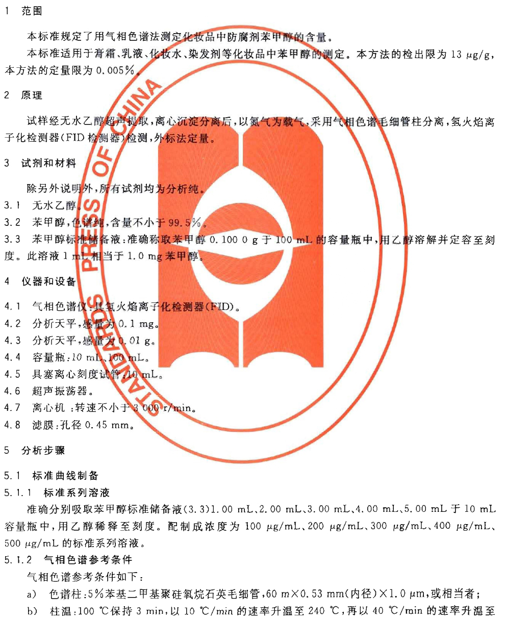 GB/T 24800.11-2009 化妆品中防腐剂苯甲醇的测定 气相色谱法