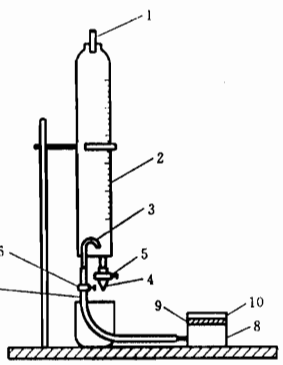 1一口塞;2一玻璃量筒;3一导气管;4一排水管;5一水流控制开关6-空毛控制开关;7一胶皮导气管;8一空气测试室;9一试样;10-盖帽