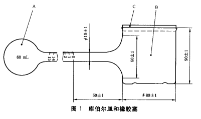 4.1 库伯尔皿,玻璃制(见图1),最小刻度0.1 mL,准确度士0.05 mL,球形部分(A)和刻度管部分的总容积为75 mL±2 rnL。