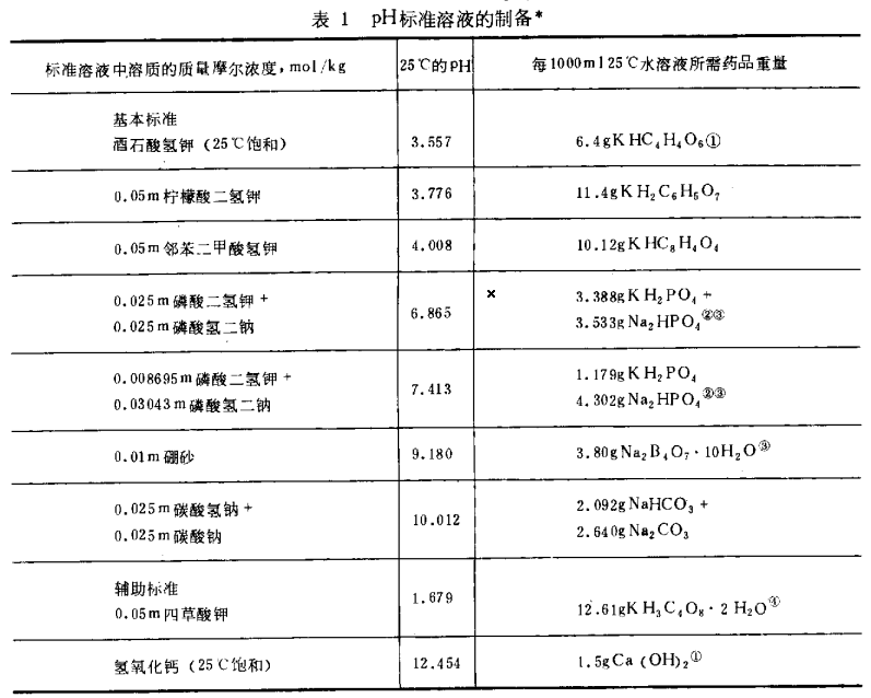 4.2 当被测样品pH值过高或过低时,应参考表1配制与其pH值相近似的标准溶液校正仪器。