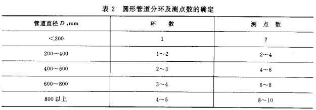 3.6.1圆形断面:将管道断面划分为适当数量的等面积同心圆环,各测点均在环的等面积中心线上,所分的等面积圆环数由管道直径大小而定,并按表2确定环数和测点数。