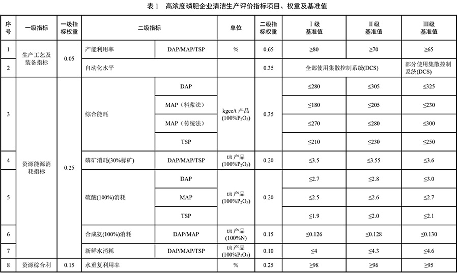 磷肥工业高浓度磷肥企业清洁生产评价指标项目、权重及基准值,见表 1。